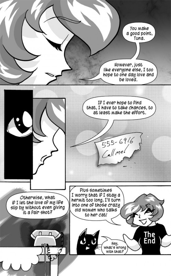 RACHEL: "Plus sometimes I worry that if I stay a hermit too long, I'll turn into one of those crazy old women who talks to her cat!"