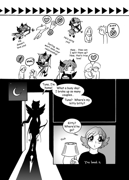 ANTI-CUPID: "Tuna, I'm home! What a busy day! I broke up so many couples... Tuna? Where's my kitty bitty?"