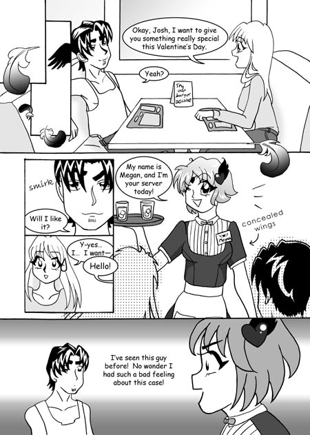 The Anti-Cupid appears disguised as a waitress named "Megan" with her wings concealed under her uniform, carrying a tray with drinks.
