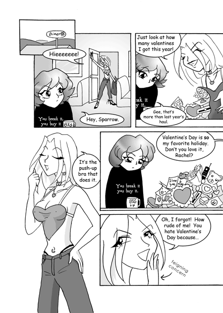 Sparrow leans over her pile of Valentine's gifts, speaking cheerfully to an annoyed-looking Rachel.