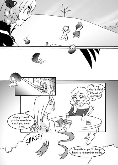 The Anti-Cupid watches from above as the woman storms away from Dirk in the park. Small birds/cherubs flutter around.
