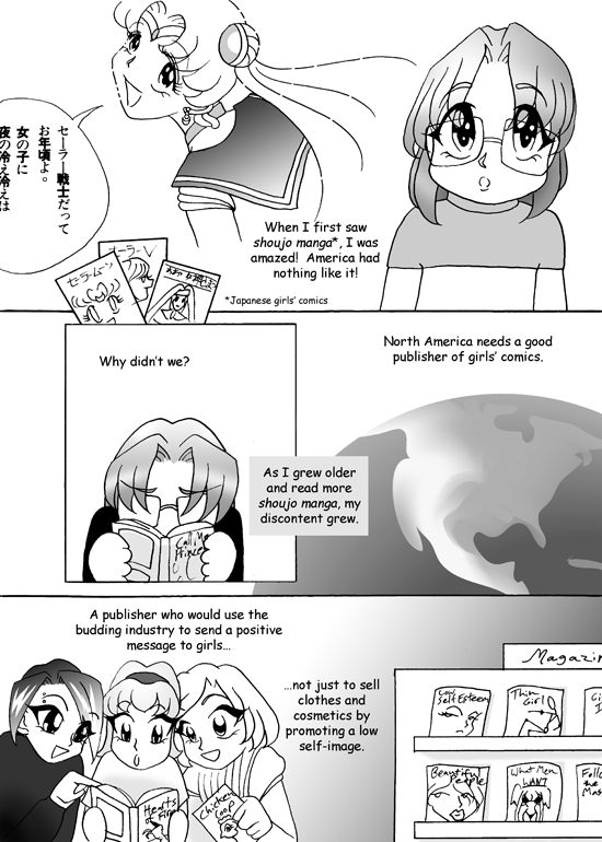 I loved Sailor Moon growing up. Naoko Takeuchi was a great inspiration to me. Because of her creation, I tried to draw better and started studying Japanese. I saw the need for a publisher of girls comics. I still think we need a publisher of positive girl-geared comics, but with the publishing industry wallowing around in the digital age, I’m not so sure if it would resemble the girls comics publishing company I envisioned as a teen.