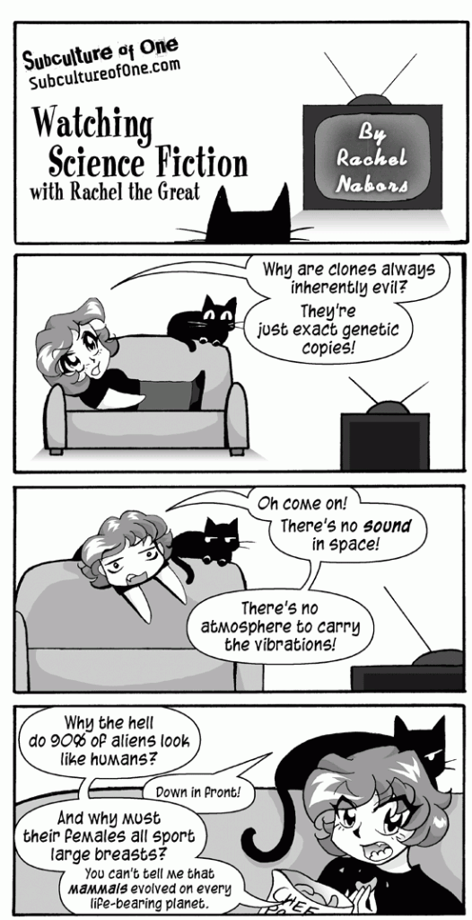 My dad has banned me from his room while science fiction. Even though I hate doing science in school, science (taught the right way) has always appealed to me. So if I see something in a movie or show that is supposed to be “science” fiction, I instantly criticize everything that isn’t scientifically correct. I figure if they don’t want people to complain about it, they should make it where the fact sounds factual and is believable and realistic. Or quit never to write science fiction again.