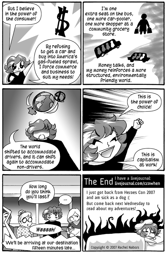 Some of the comments on this comic frustrated me. Most were encouraging, but others underscored the “Driving Divide” in America. It’s this “us vs. them” mindset that makes some truck drivers sneer at me in my smart car and that makes some hybrid drivers feel superior. It shouldn’t be like that. What you choose to drive is your own business. If you buy a gas guzzler, I will pity you when the prices rise. If someone in a truck thinks I’m not safe in my tiny smart car, they can pity me and m family when I die in a car crash (which is not likely, since smart cars are much safer than people think). Those are our decisions. When we antagonize each other, though, it makes it harder for either side to compromise when they need to. I’d much rather someone in an SUV be open to living closer to where they work and making better choices for future generations than stubbornly refuse to consider environmental issues because they see them as an assault on their character.