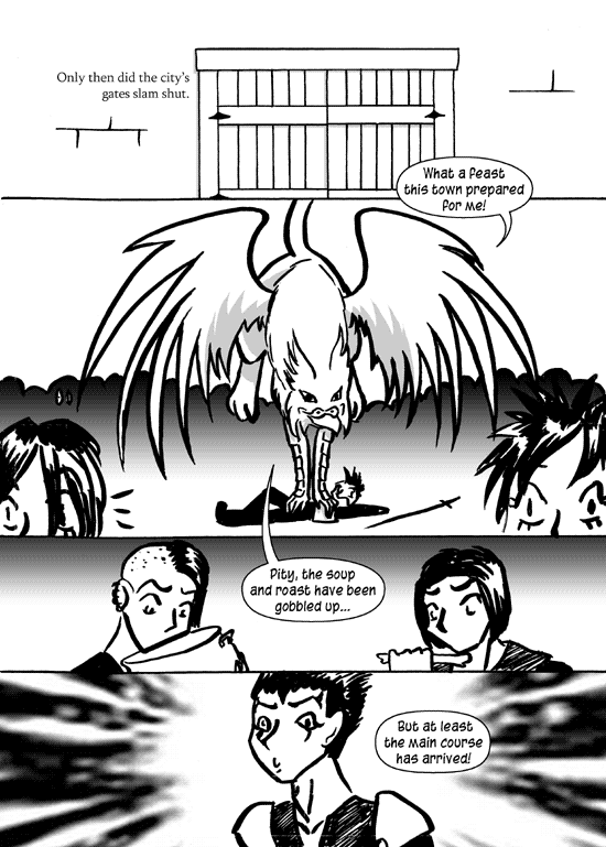 I guess now is a good time to bring up the materials I used to make this baby. I drew it on Deleter brand doujinshi size paper in “heavy” weight from Anime Gamers. I inked it with a brush-tipped Tombo marker I bought at a local art store. That’s why the lines seem so thick and expressive. The small paper size and versatile inking method helped speed up the process. One problem: The marker wouldn’t cover the blue guidelines on the Deleter paper. You can see a faded white line at the bottom of this page where the marker refused to cover it (right through the lead-Goth’s shirt).