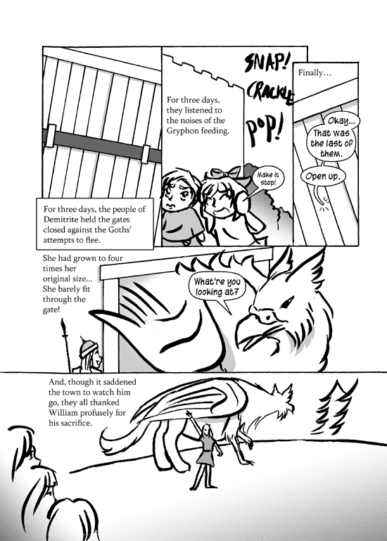 The Griffin is now enormous, having grown from feeding. Guards in armor watch from the foreground.