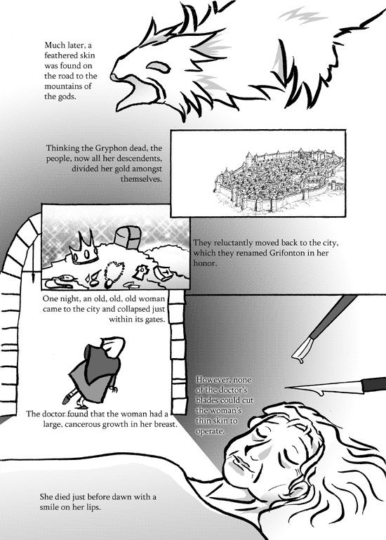 NARRATOR: "Thinking the Gryphon dead, the people, now all her descendents, divided her gold amongst themselves."