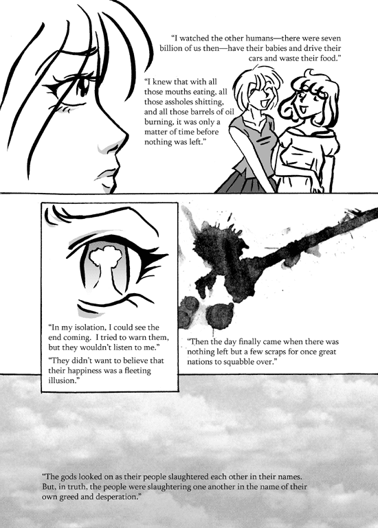 Alas, I did not get to develop the Gryphon’s story here as much as I would have liked. I’ll be lucky if anyone sympathizes with her at all. There just wasn’t enough room to show the kind of things she was seeing and feeling. I had a lot of rage against administration and the rich and poor written into the story, but it made the comic run to 26 pages. After I cut and trimmed it out, the page count fell to 22. It was okay, though. I needed more room at the end of the book anyway.