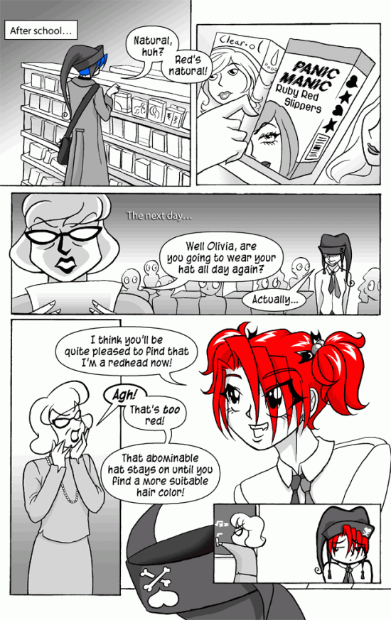 Olivia stands in a store aisle looking at hair dye boxes. She wears a black hat with skull and crossbones. She picks up a box labeled "PANIC MANIC - Ruby Red Slippers" with "Clear-o" branding. The box shows a woman with flowing red hair.