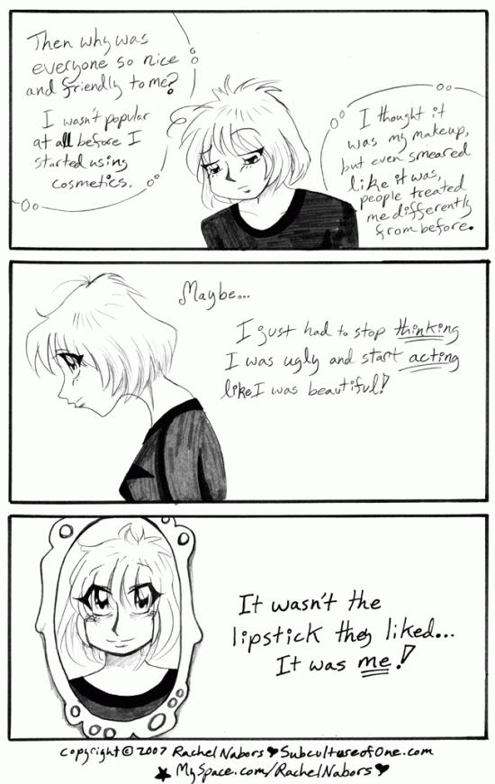 This was based on a true story. I quickly forget my own lessons, though. After jaw surgery I didn’t bother putting makeup on until the swelling had subsided. But people were smiling and treating me nicely long before I started using the stuff again, even misshapen as I was. I must have been doing something right!