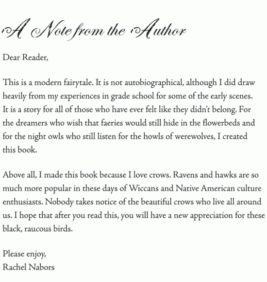 This is a modern fairytale. It is not autobiographical, although I did draw heavily from my experiences in grade school for some of the earlier scenes. It is a story for all those who have ever felt like they didn’t belong. For the dreamers who wish that faeries would still hide in flowerbeds and for the night owls who listen for the howls of werewolves, I created this book.