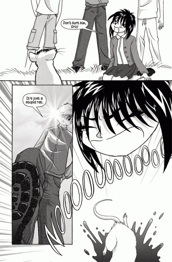 The small white mouse sits on the ground. A bully stands over it menacingly while Cora sits nearby, pleading.