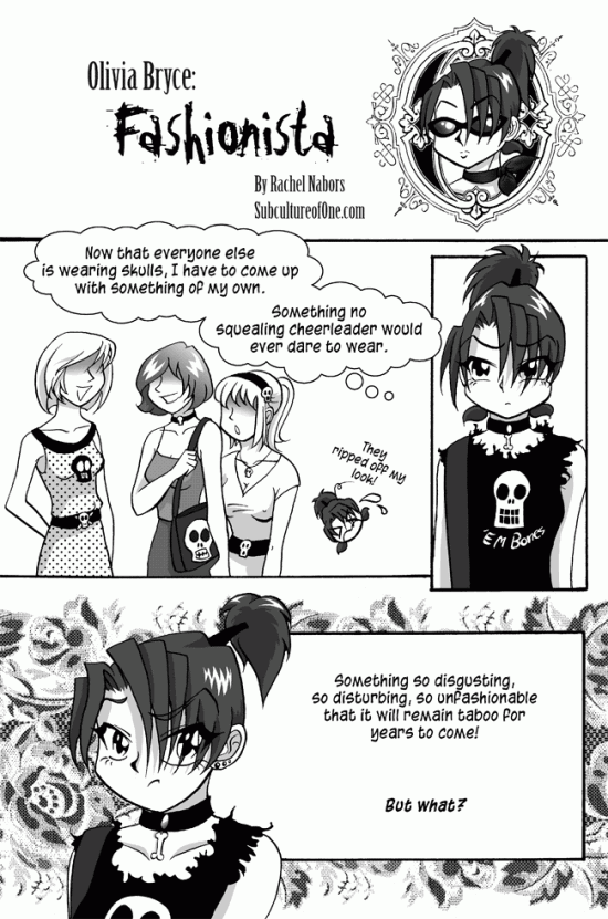 Decorative banner reads "Olivia Bryce: Fashionista By Rachel Nabors SubcultureofOne.com" with an ornate oval frame containing a cameo portrait of Olivia.