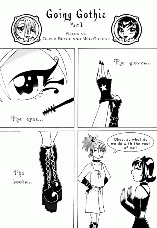 Olivia stands in a simple white blouse and choker, looking uncertain, while Meg (fully gothified with dark clothes) stands beside her.