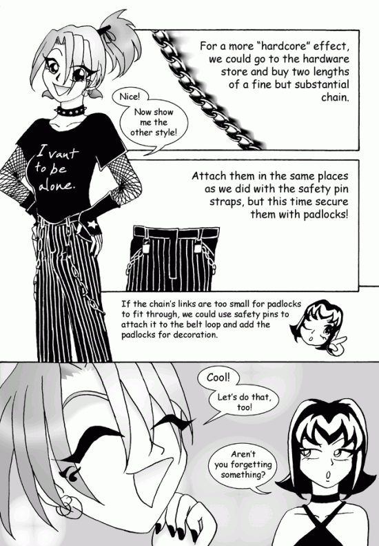TEXT: "If the chains links are too small for padlocks to fit through, we could use safety pins to attach it to the belt loop and add the padlocks for decoration."