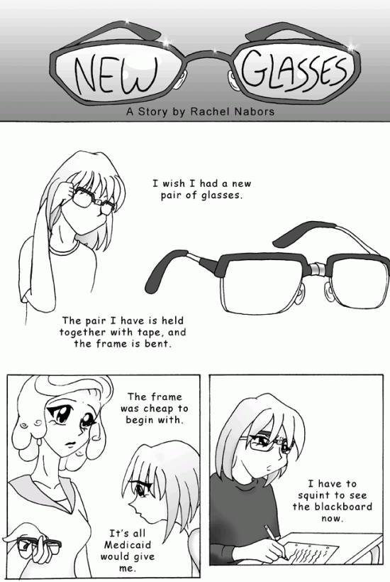The only difference between this comic and reality was that Medicaid did not pay for my glasses. After we jumped through many hoops and forms with Medicaid, in the end they decided to go to my father in Pennsylvania to recoup the cost of the cheap glasses it bought me. Man, these glasses were so cheap. The frame looked like something from a vending machine. The lenses where the thickest, heaviest plastic because of my high prescription and because the “plan” didn’t provide any little upgrades for things like the thinner lenses available.