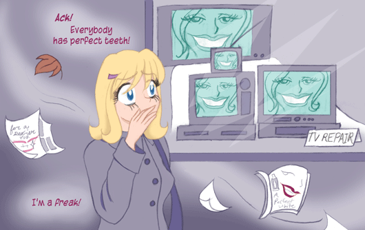 BLONDE WOMAN: "Ack! Everybody has perfect teeth!"