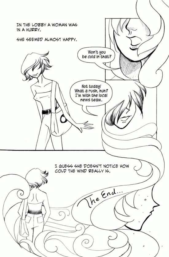 This comic was drawn in blue line, which I sketched over. I scanned the boards and knocked out the blue. My favorite thing about this comic is the swirlies representing hair, water, and wind. They are some of my favorite things to draw, but it’s hard to find an appropriate window to use them.