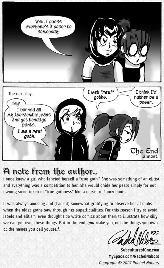 It was always amusing and (I admit) somewhat gratifying to observe her at clubs when the older goths saw through her superficialities. For this reason I try to avoid labels and elitism, even thought I do write comics about them to illustrate how silly we can get over these things. But in the end, you make you, not the things you own or the names you call yourself.